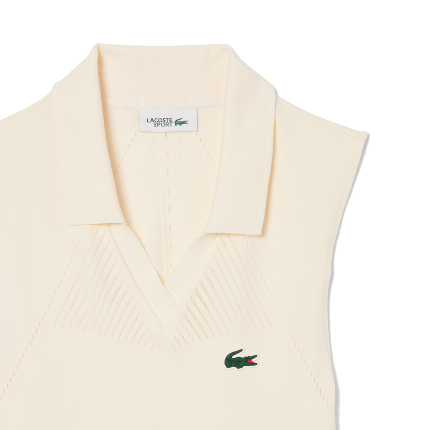 1. #description#Testée et approuvée par les joueuses Lacoste, cette robe tennis stretch illustre le savoir-faire maille de la maison. Fruit d'une technique de tricot innovante, elle arbore un tissu sans coutures qui suit les lignes du corps, libère le mouvement et offre une grande respirabilité. Ses découpes singulières et des finitions soignées ajoutent l'élégance à la performance.